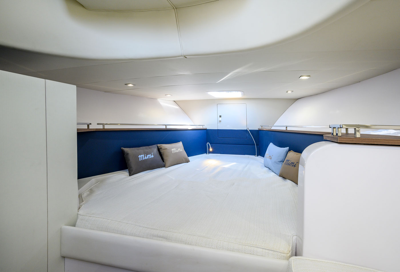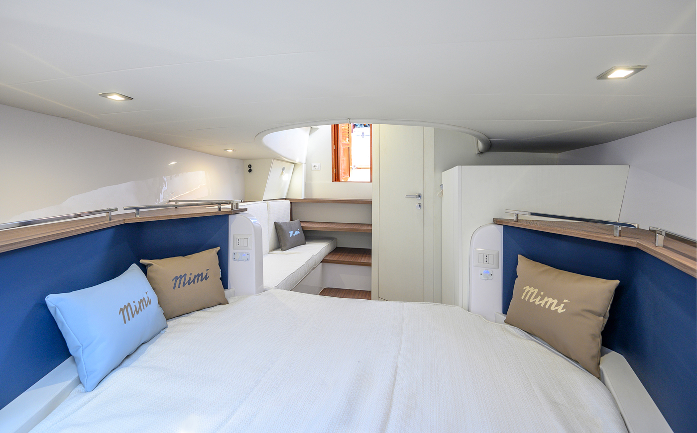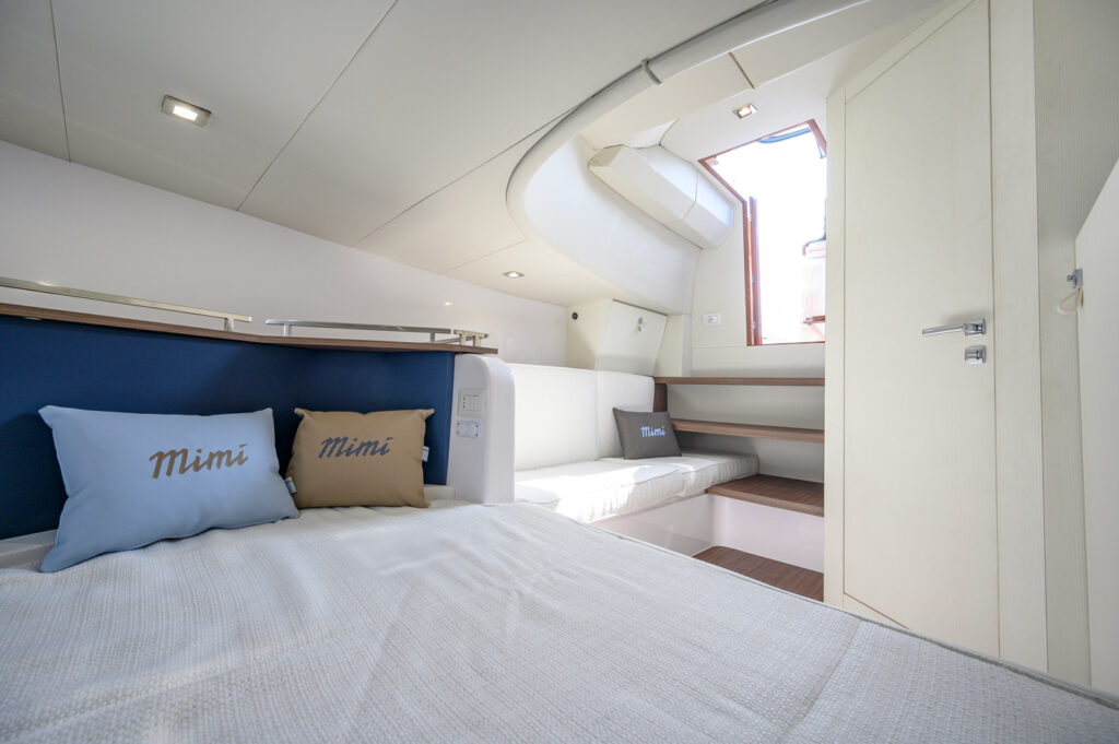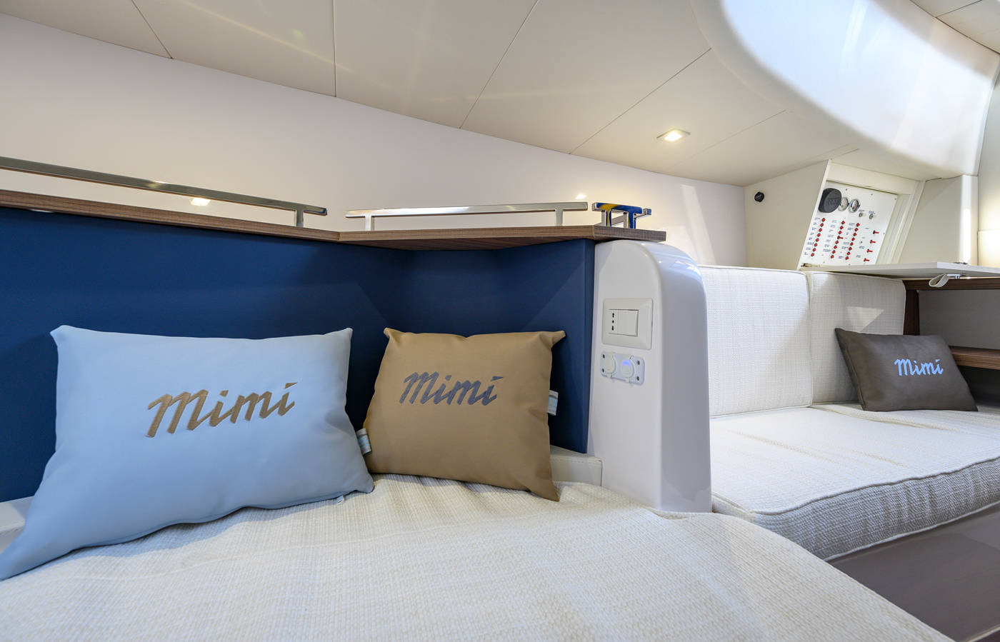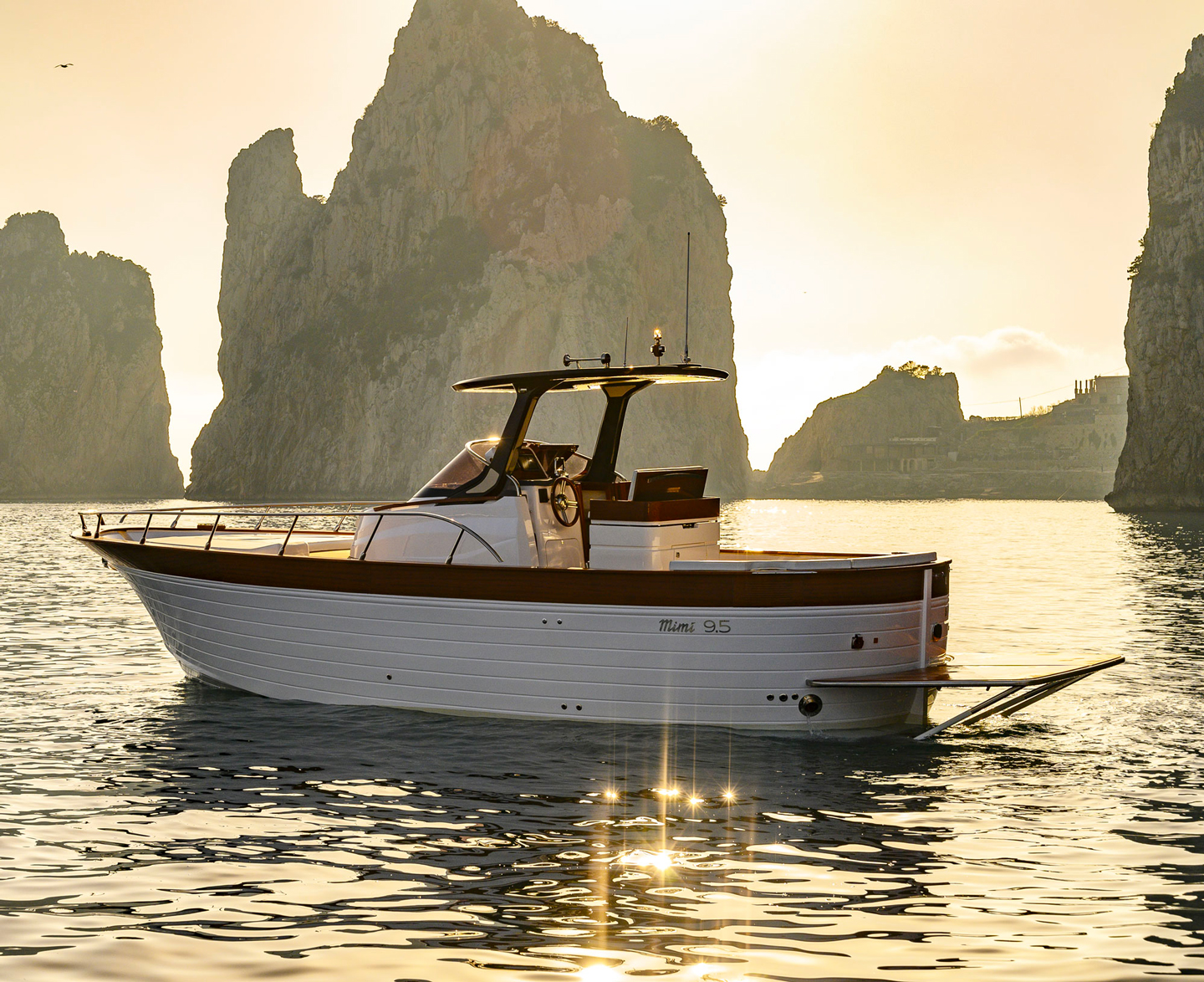 The Libeccio 9.5 Walkaround is a model that is both youthful and elegant at the same time, characterised by some rather novel solutions "such as the hard top with arms mounted on the front console and the polished mahogany stern bar unit with concealed seating that can also be used as a kitchen unit," as Valerio Rivellini, who designed the project, recounts.